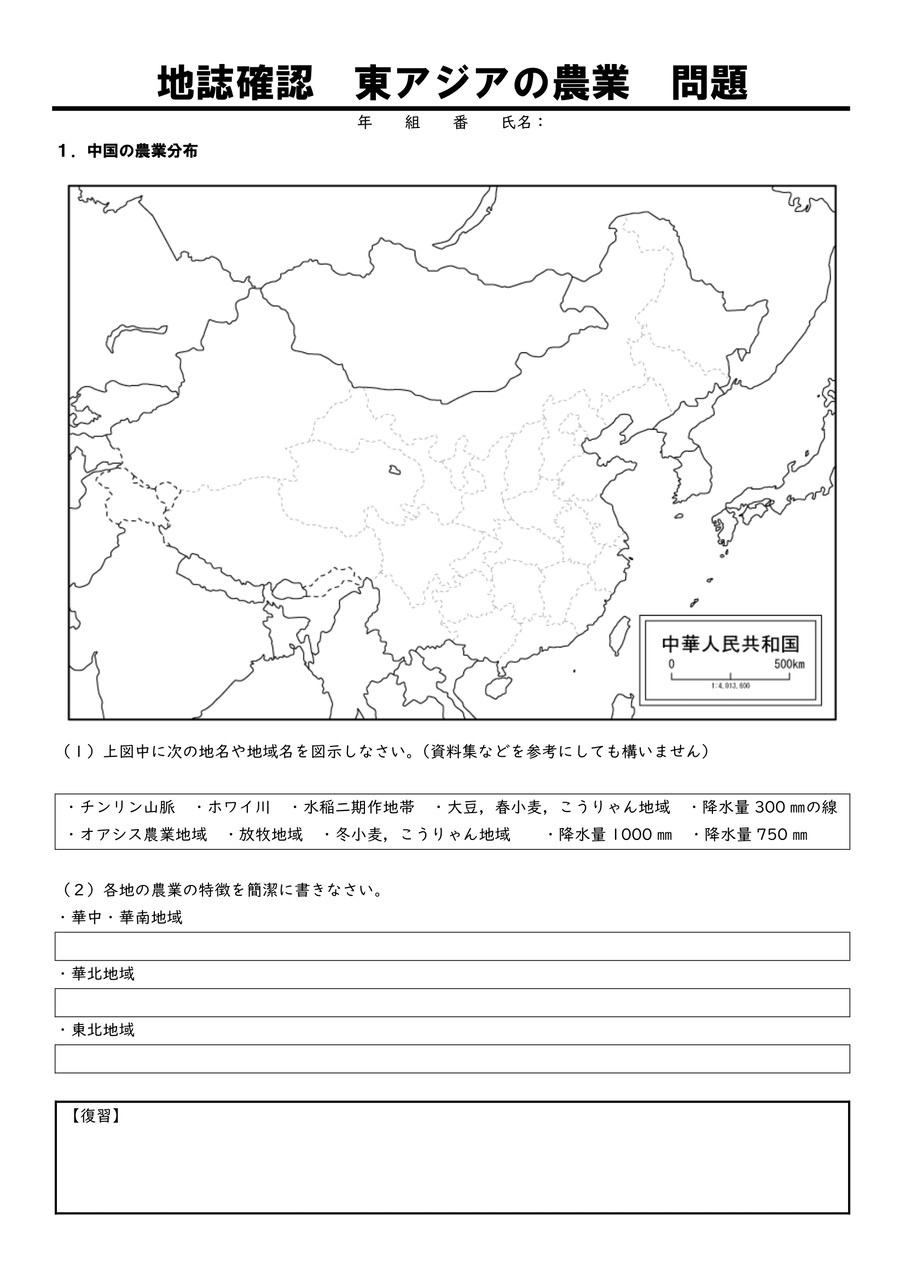 最低限降水量1000㎜のラインである、チンリン山脈・ホワイ河のラインは書き込めるようにしましょう。