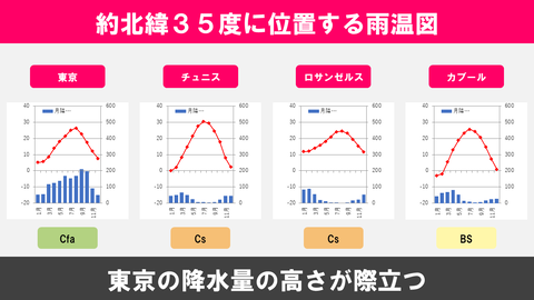 【図解】約北緯35度に位置する都市の雨温図
