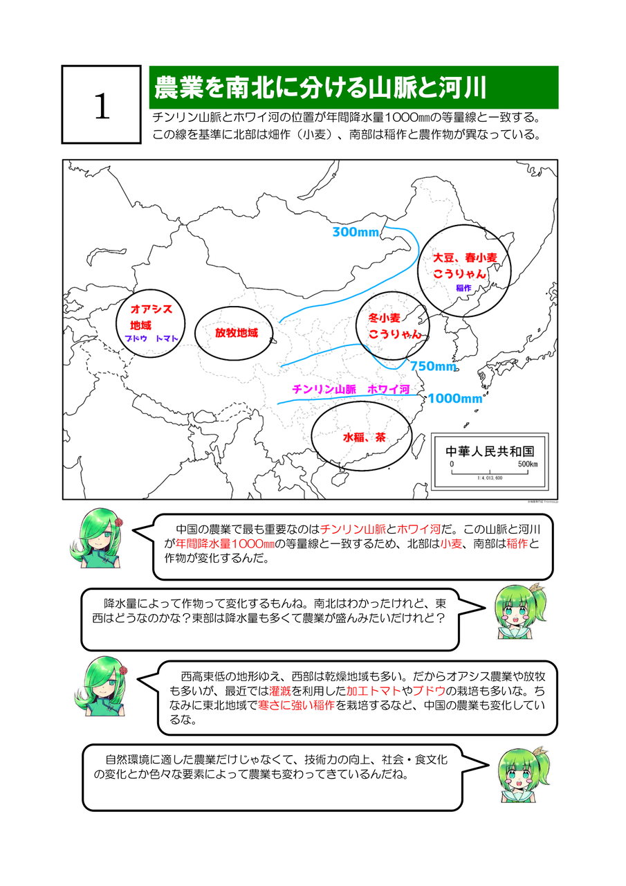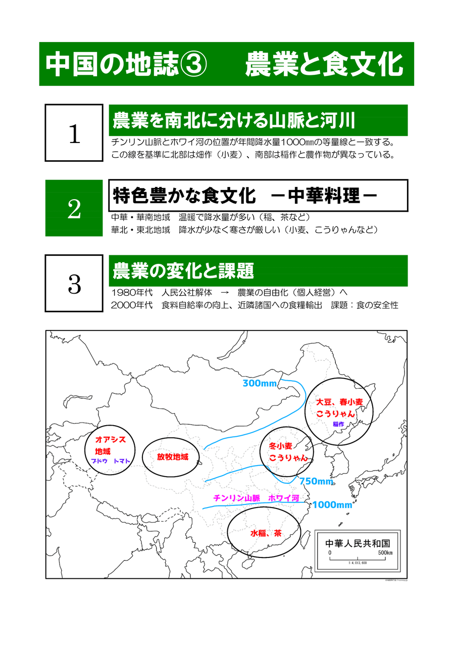 2020年11月02日 【地誌】中国の地誌③ 中国の農業 中国の地誌第3弾「中国の農業」について書いてみました。チンリン山脈、ホワイ河の農業変化や日本への農作物の輸出など、出題内容は多岐にわたります。各地域の農業特徴をしっかり理解しましょう。中国の地誌③ 中国の農業.pdf < 前の記事次の記事 > コメント コメントフォーム 名前 コメント 記事の評価 リセット リセット 顔 星 情報を記憶 コメントを投稿する