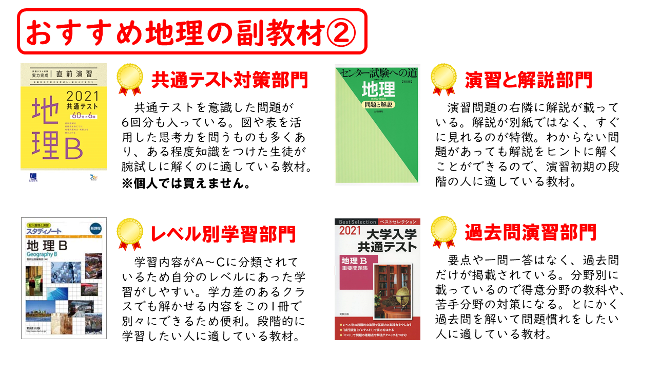 2021年01月22日 【レビュー】おすすめの地理の副教材② 地理の副教材の第2弾を書きました。第2弾は要点をまとめることよりも演習に向いている教材を中心にレビューしてみました。来年度受験クラスを担当するかもしれない先生方、参考にしてみてください。情報送ってくれた先生方いつもありがとうございます。いいレビューができました。 < 前の記事次の記事 > コメント コメントフォーム 名前 コメント 記事の評価 リセット リセット 顔 星 情報を記憶 コメントを投稿する