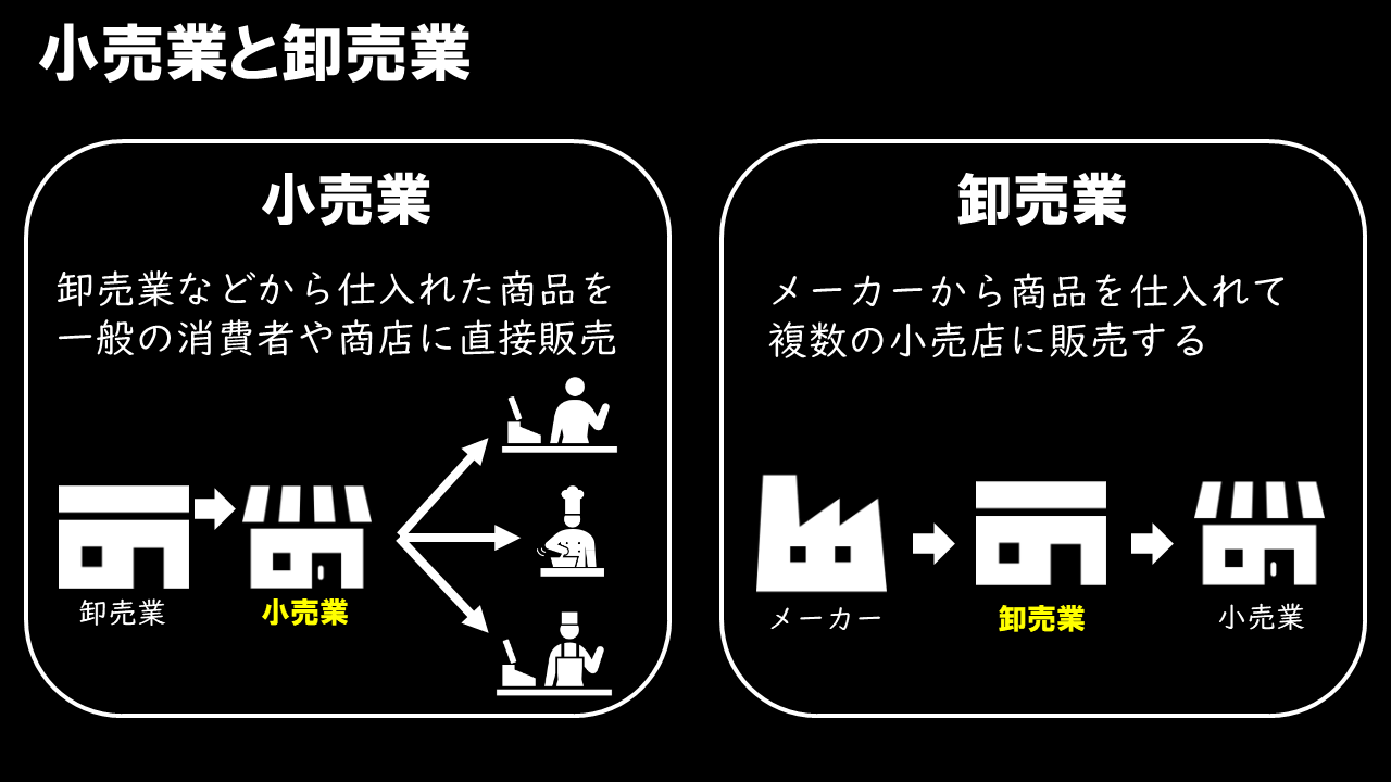 2021年04月09日 【図解】小売業と卸売業 小売業と卸売業の違いについて図解してみました。 < 前の記事次の記事 > コメント コメントフォーム 名前 コメント 記事の評価 リセット リセット 顔 星 情報を記憶 コメントを投稿する
