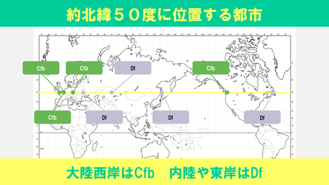 【図解】約北緯50度に位置する都市の気候区分