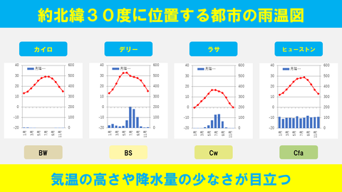 【図解】約北緯30度に位置する都市の雨温図