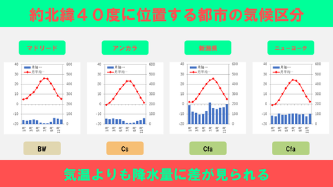 【図解】約北緯40度に位置する都市の気候区分