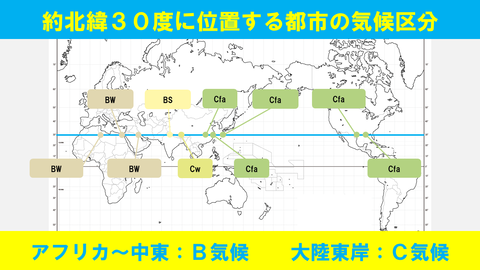 【図解】約北緯30度に位置する都市の気候区分